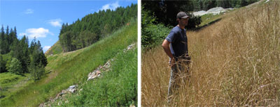 The short term objective for the fill slope was to stabilize the site with grasses applied as seed. We selected Elymus glaucus, a workhorse species, as the primary grass species because it was dependable, established quickly, formed a good cover for erosion control, and grew in similar environments as the road fill.