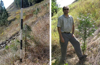 Our long-term objective was to establish trees on the middle to lower portion of the fills to stabilize the slopes, soften the appearance of the large road cut, and to screen the roadcut from the private property below the fill. We choose ponderosa pine, Douglas-fir, and incense cedar because these were the species surrounding these slopes. Large container tree seedlings were used for several reason. A large container stocktype was used for fast growth and to overcome some of the limitations of the site.