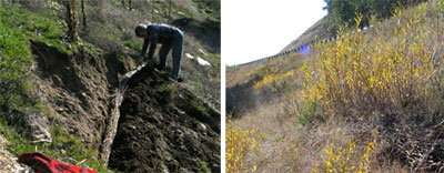 In the lower portions of the fill slope were seeps that occurred during the winter months and promoted shallow slumping. We used willows in these areas because they are a fast-growing, water-loving species that can quickly stabilize a slope. While willows can be established from seedlings, we used cuttings instead because this stocktype can be installed in ways that add structural support to the slopes or drain water from the soils.